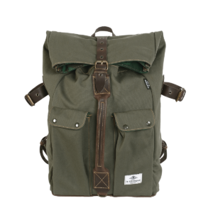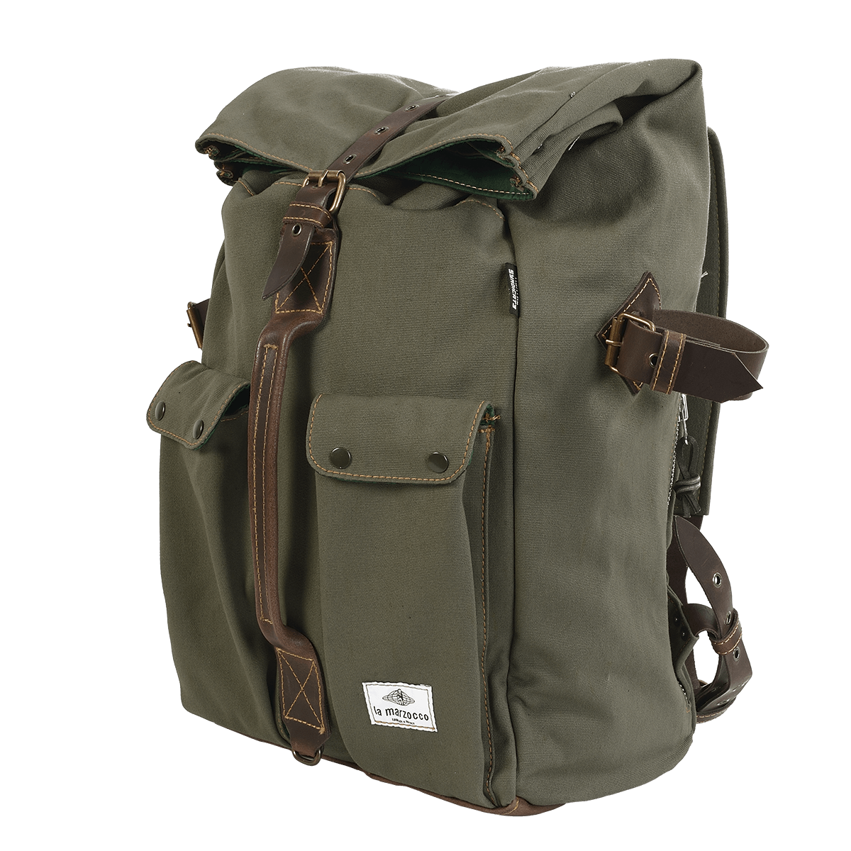 Confeccionada con lona militar resistente al agua y cuero de montar, esta mochila La Marzocco de cierre enrollable se convertirá en tu fiel compañera de viaje.