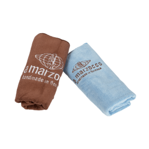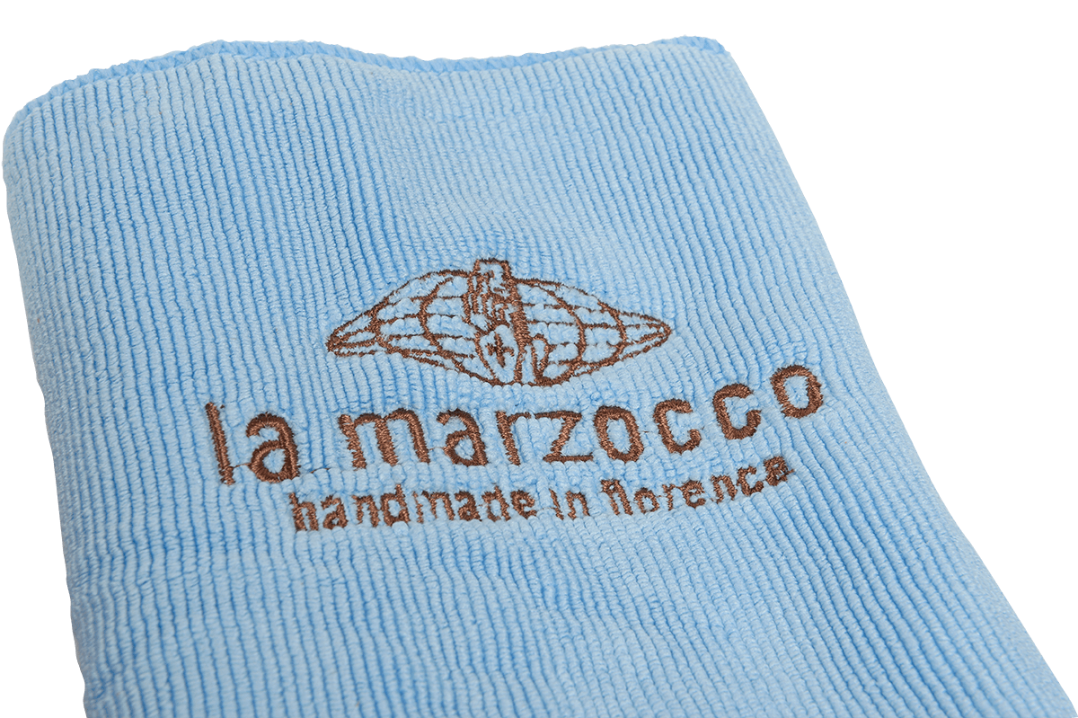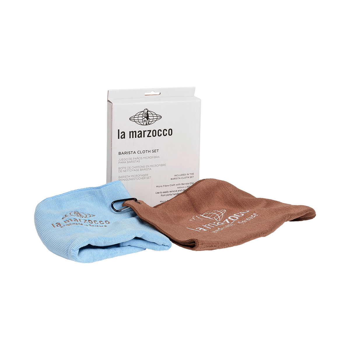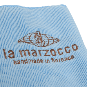 Este conjunto de paños de barista es ideal para el cuidado del equipo, consta de 2 paños de microfibra con el logo de La Marzocco bordado y un clip para sujetarlo al cinturón o al lazo de los pantalones. Un conjunto en color azul claro y marrón para acompañarte en la preparación del café.