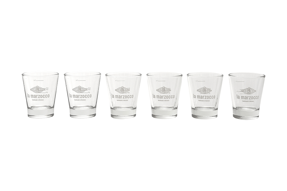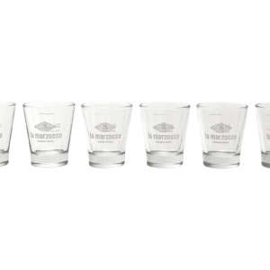 Conjunto de 6 vasitos cilíndricos de chupito, diseñados con el icónico logotipo de La Marzocco. Cada vaso incluye marcas de medida precisas, perfectas para servir tus bebidas favoritas con estilo y exactitud.
